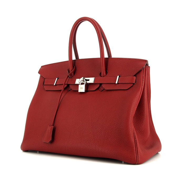 Élégant sac à main Hermes Birkin 35 cm en cuir togo rouge, garniture en métal palladié, double poignée en cuir rouge permettant un porté main.