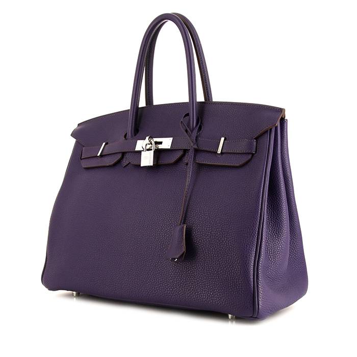 Rarissime sac à main Hermes Birkin 35 cm en cuir togo violet, garniture en métal palladium, double poignée en cuir violet permettant un porté main.