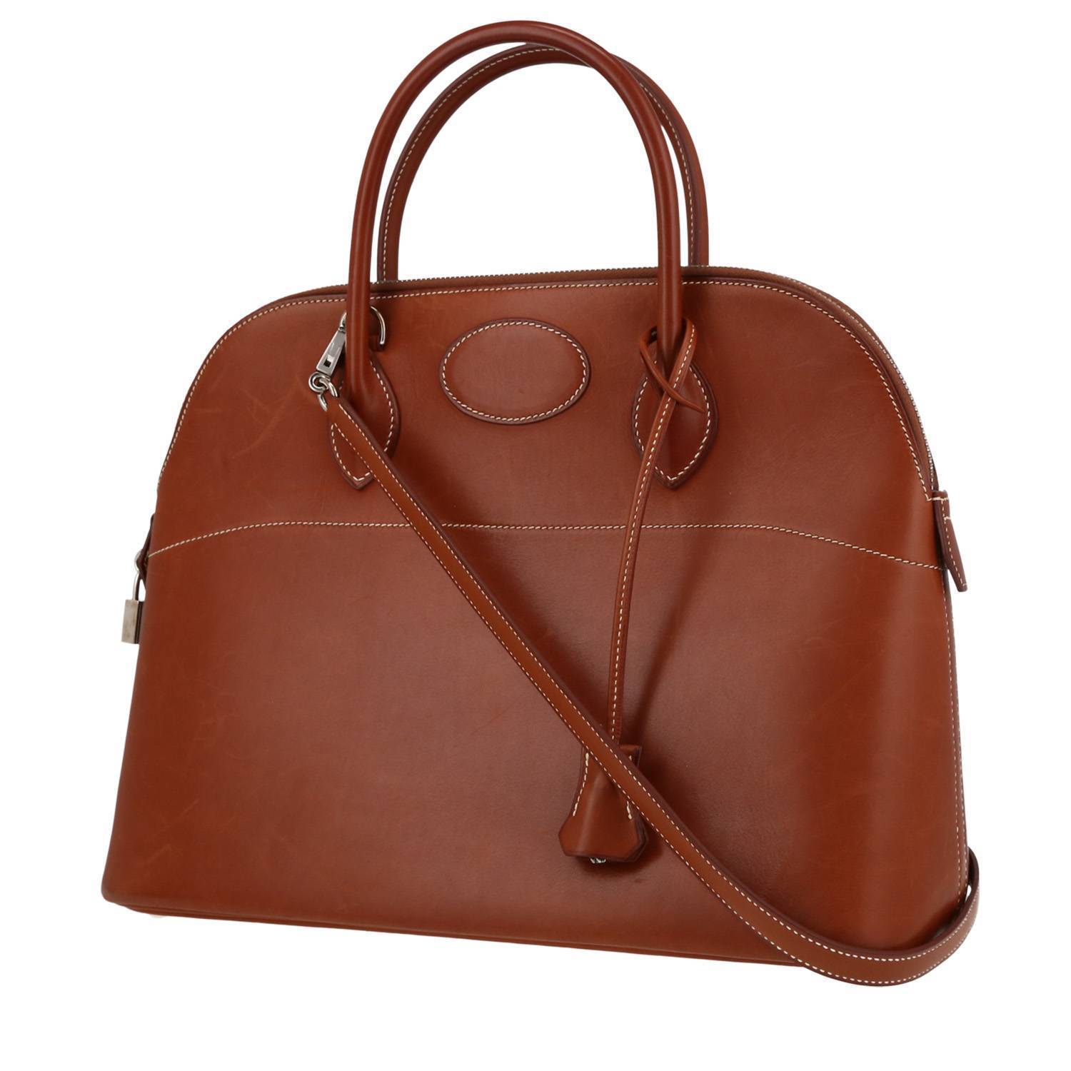 Classique sac à main Hermès Bolide 35 cm en cuir Barénia marron, garniture en métal palladium, double poignée en cuir marron, anse bandoulière amovible en cuir marron permettant un porté main ou épaule.