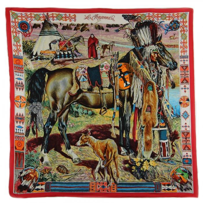 Charmant Carré foulard "Les Cheyennes" dessiné par Oliver Kermit en twill de soie rouge et multicolore.