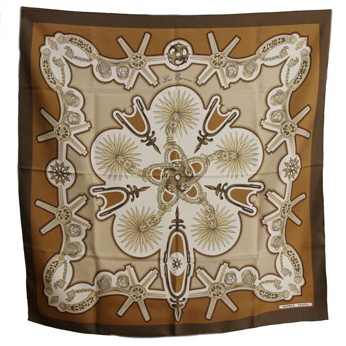 Hermes carré foulard Les éperons en toile beige et marron Ref Collector Square : 29 72 23