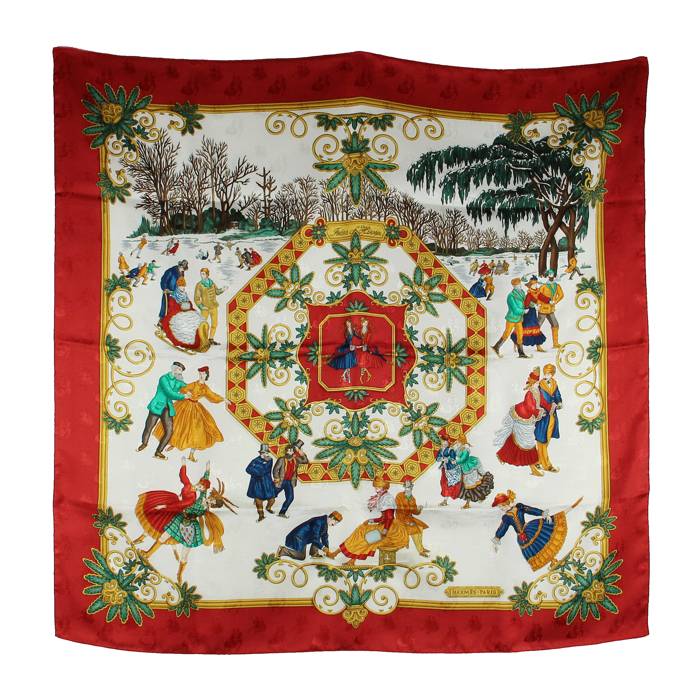 Charmant carré foulard "Jolies d'hiver" en twill de soie damassé blanc et bordures rouges représentant des scènes de personnages profitant des divertissements hivernaux.