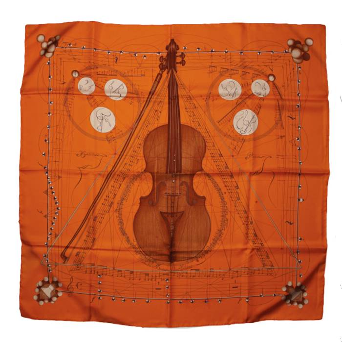 Charmant carré en twill de soie "La musique des sphères" dessiné par Zoé Pauwels à dominante orange représentant le mariage entre la musique et les mathématiques.