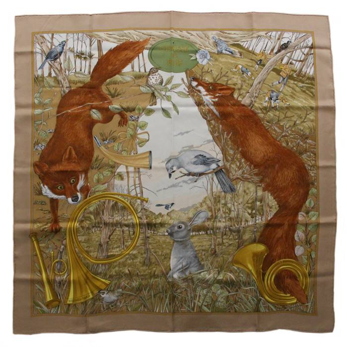 Charmant carré foulard "Chasse au bois" en twill de soie marron et beige à décor d'animaux.