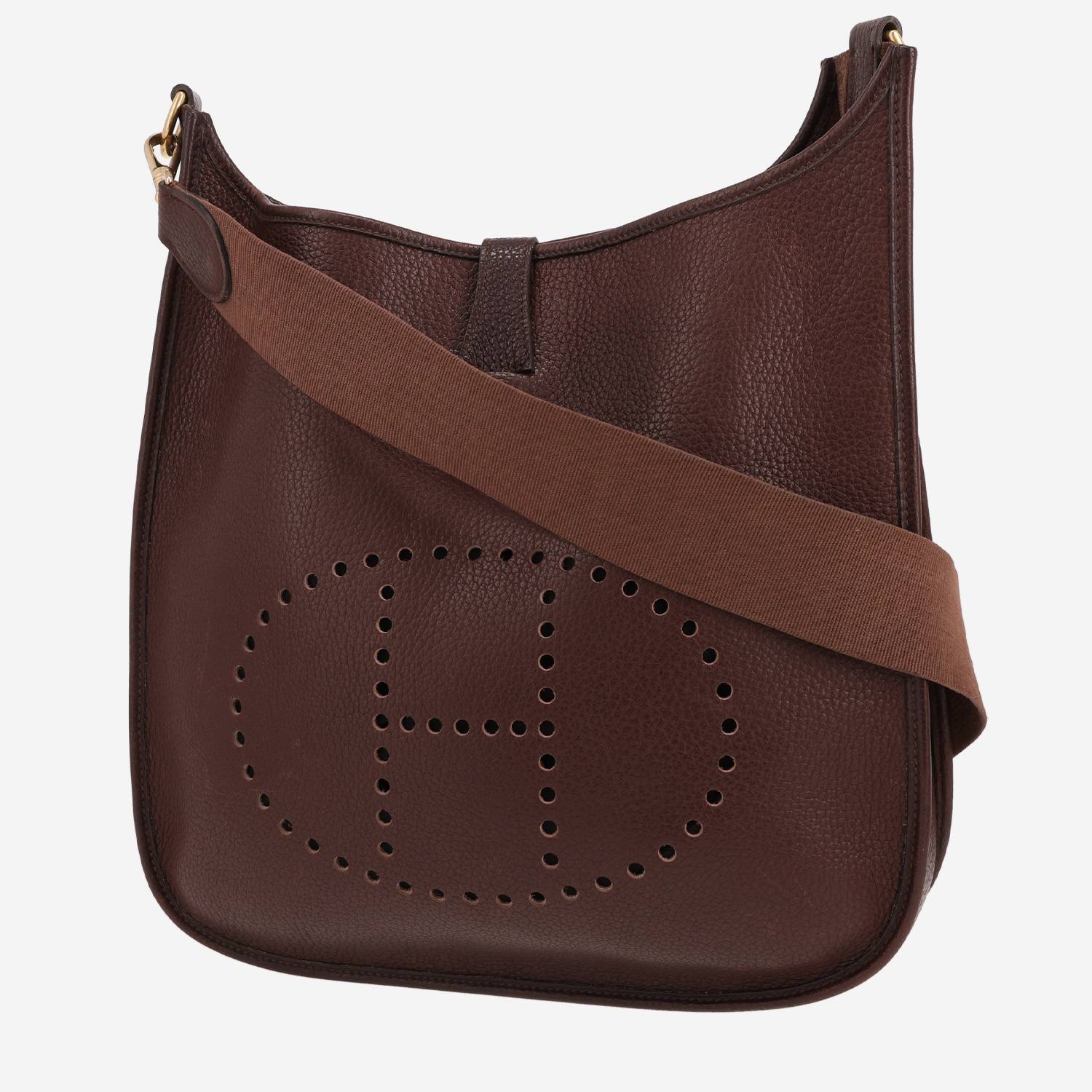 Élégant sac bandoulière Hermès Evelyne en cuir grainé marron, garniture en métal doré, une anse bandoulière amovible en toile marron permettant un porté épaule ou bandoulière.