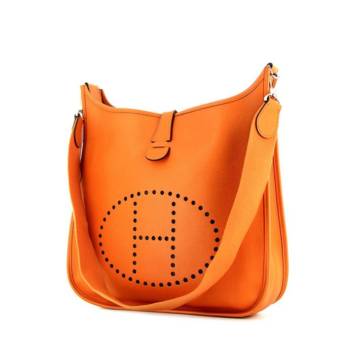 Charmant sac bandoulière Hermes Evelyne moyen modèle en cuir epsom orange, garniture en métal palladié, une anse amovible en toile orange permettant un porté épaule ou bandoulière.