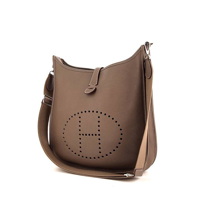 Pratique sac bandoulière Hermes Evelyne moyen modèle en cuir togo étoupe, garniture en métal palladié, surpiqures crème, une anse amovible en toile étoupe permettant un porté épaule ou bandoulière.