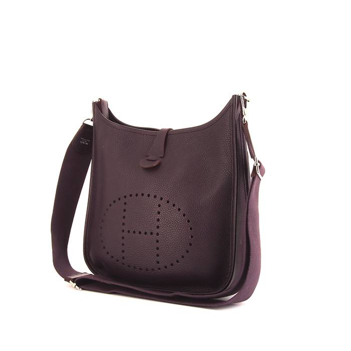Élégant sac bandoulière Hermes Evelyne petit modèle en cuir togo violet, garniture en métal palladié, une anse amovible en toile violette permettant un porté épaule ou bandoulière.