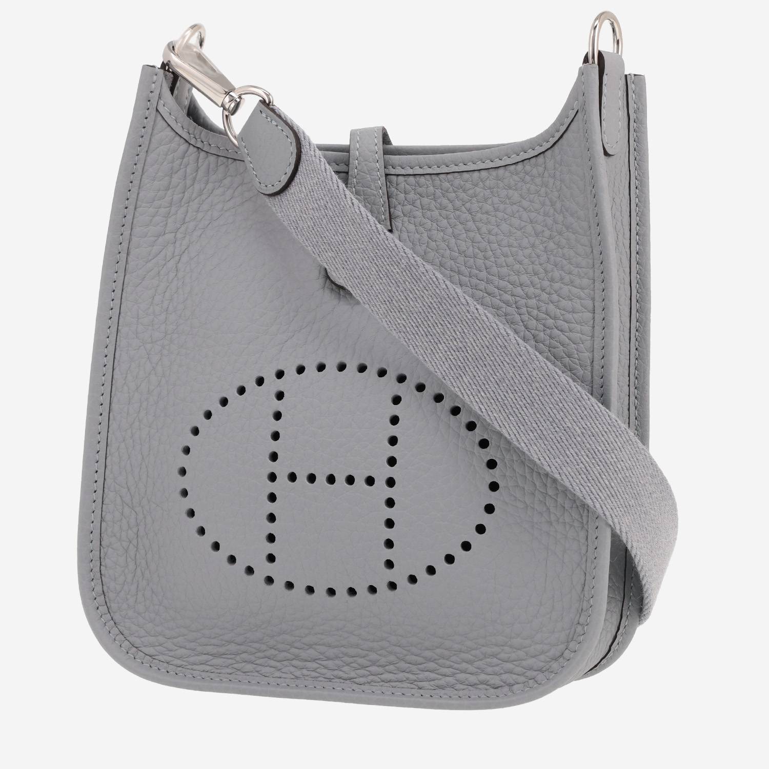 Magnifique sac bandoulière Hermès Mini Evelyne en cuir taurillon clémence Gris Pantin, garniture en métal palladié, anse bandoulière amovible en toile Gris Pantin permettant un porté épaule ou bandoulière.