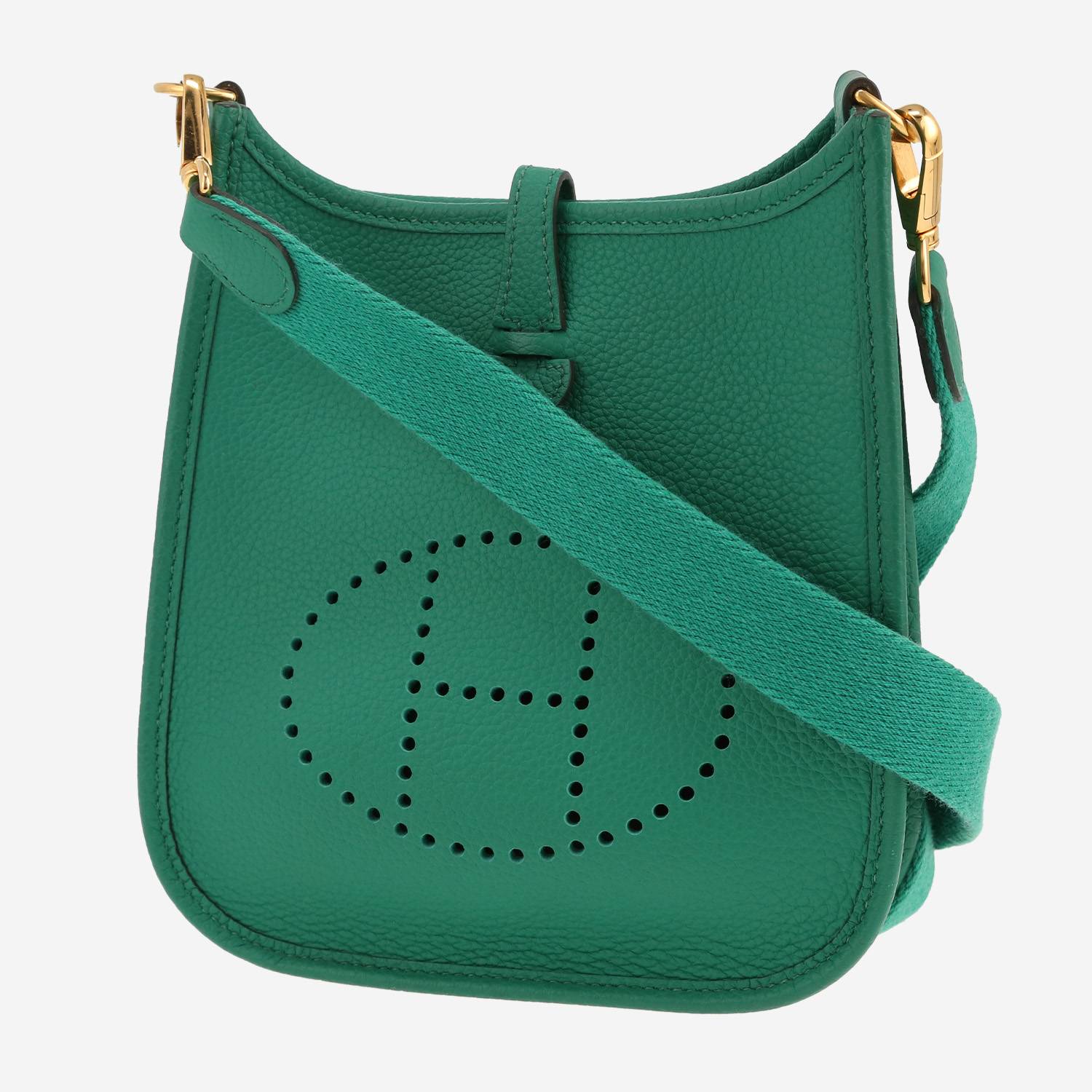 Magnifique sac bandoulière Hermès Mini Evelyne en cuir taurillon clémence Vert Vertigo, garniture en métal doré, anse bandoulière amovible en toile Vert Vertigo permettant un porté épaule ou bandoulière.