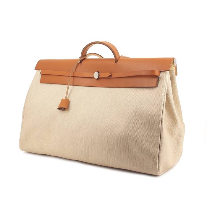 Sac à main "Herbag" grand modèle à transformation en toile beige et cuir marron, fermoir figurant un clou de selle en métal palladié sur patte de serrage, poignée en cuir marron et anse bandoulière amovible en cuir marron permettant de porter le sac à l'épaule.