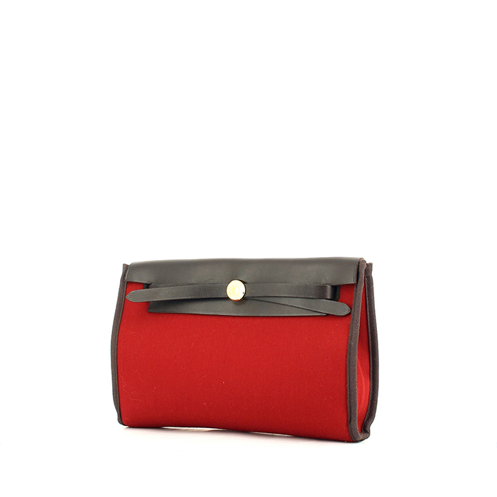 Pochette Hermès Herbag - Pocket Hand en toile orange et rouge et cuir marron, garniture en métal argenté, porté main.