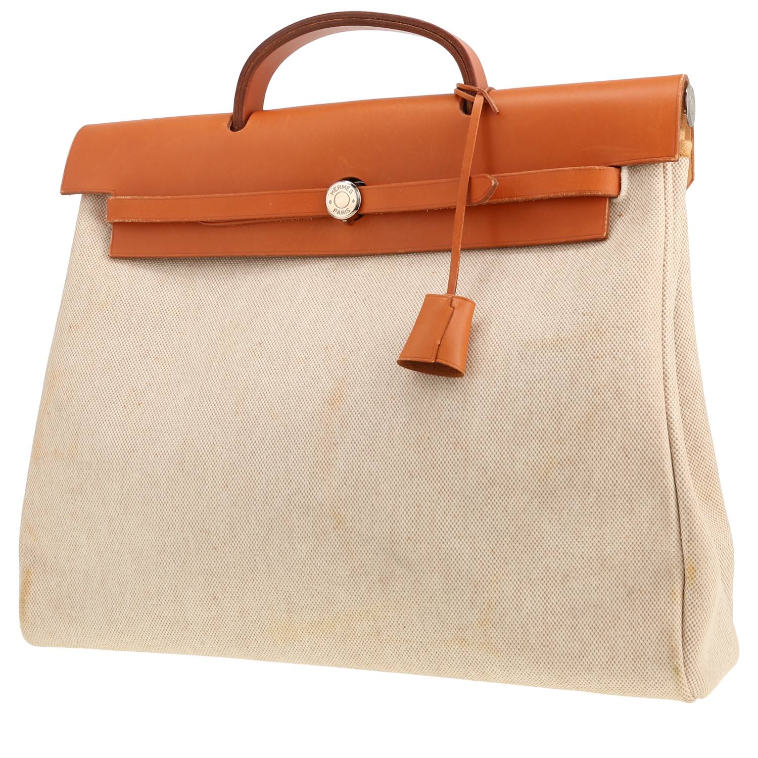 Joli sac à main Hermès Herbag en toile beige et cuir naturel, garniture en métal palladié, poignée simple en cuir naturel permettant un porté main.