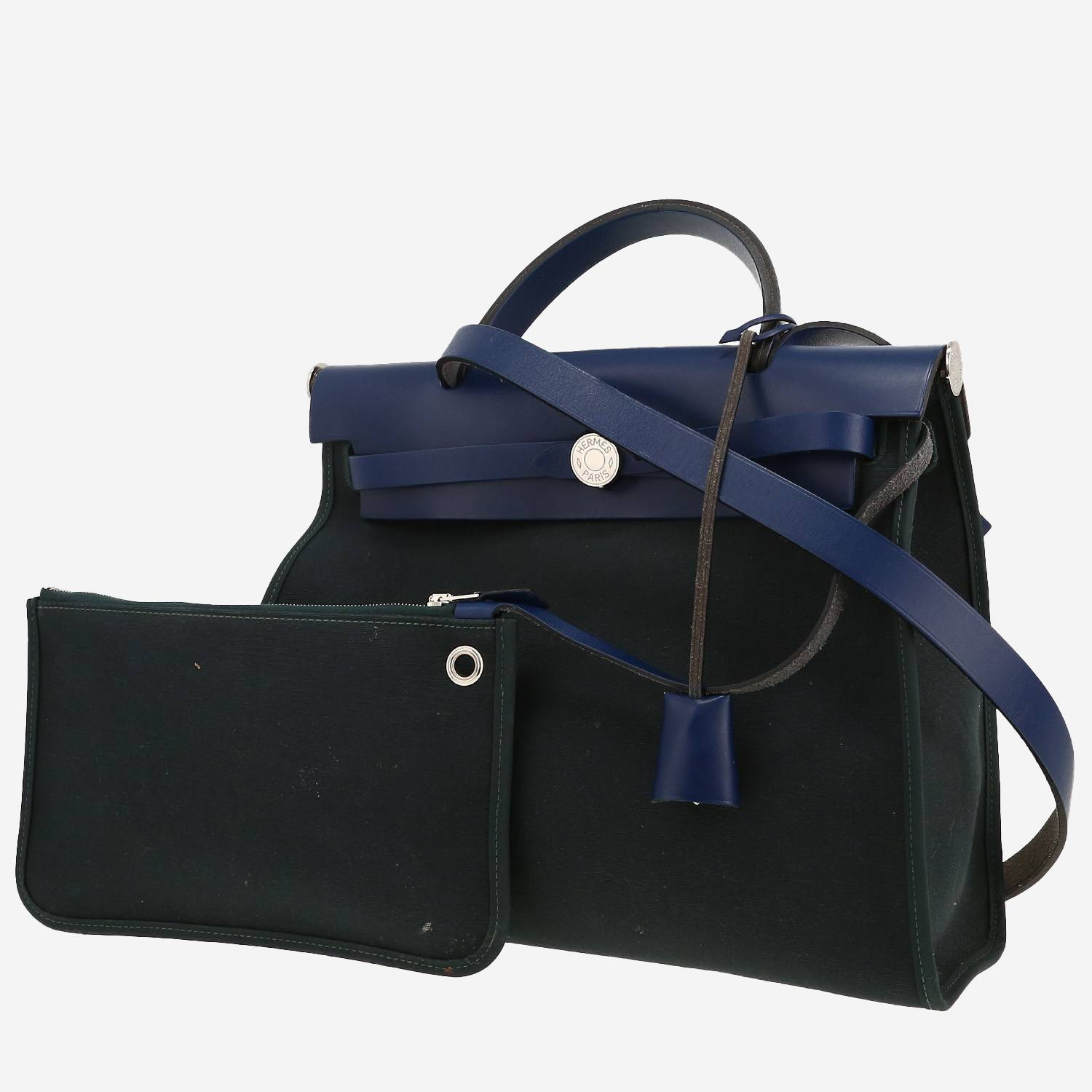 Incontournable sac à main Hermès Herbag en toile noir et cuir bleu-marine, garniture en métal palladié, poignée simple en cuir bleu-marine, anse bandoulière amovible en cuir bleu-marine permettant un porté main ou épaule.