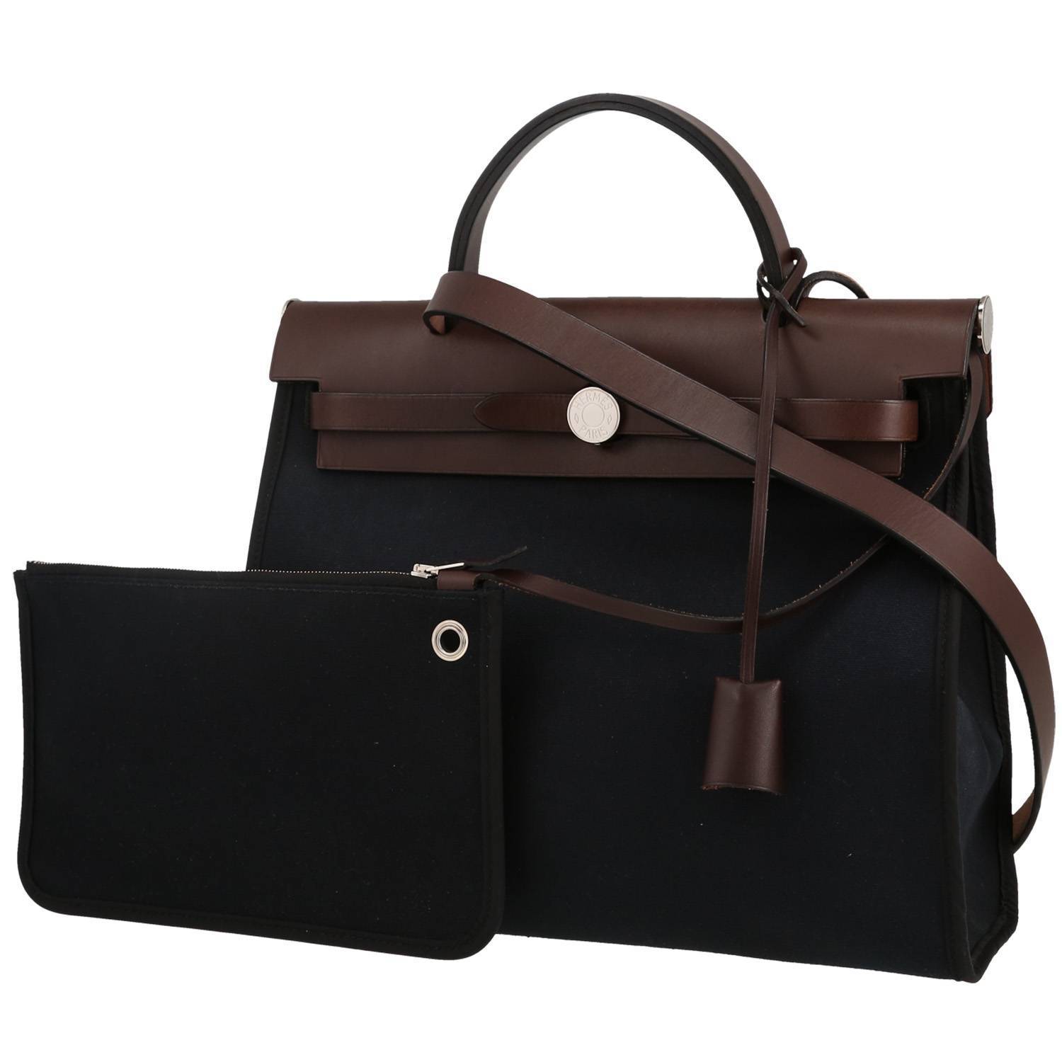 Beau sac bandoulière Hermès Herbag en toile noir et cuir marron, garniture en métal palladié, poignée simple en cuir marron, une anse en cuir marron permettant un porté main ou épaule ou bandoulière.