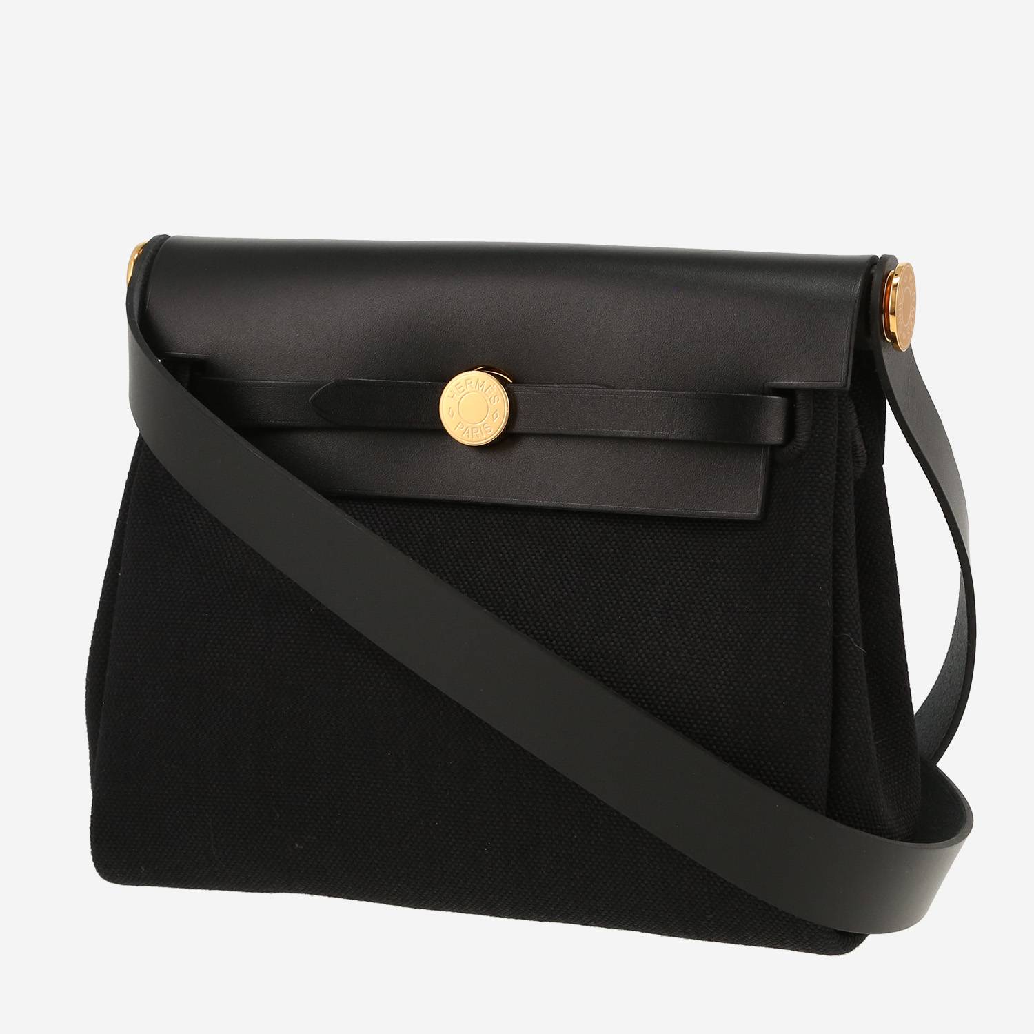 Sublime sac bandoulière Hermès Mini Herbag en toile et cuir noir, garniture en métal doré, une anse en cuir noir permettant un porté épaule ou bandoulière.