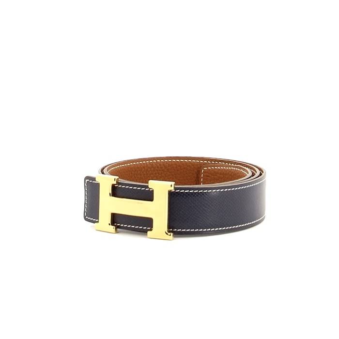 Ravissante ceinture H réversible en cuir bleu marine ou cuir grainé marron, piqures selliers blanches, boucle H, trois trous permettant d'ajuster la ceinture à la taille.