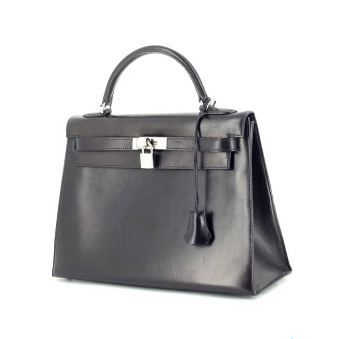 Charmant sac à main "Kelly" 32 cm en cuir box noir frappé des initiales "SL" sous le rabat, garniture en palladium, fermeture sur rabat, poignée simple.