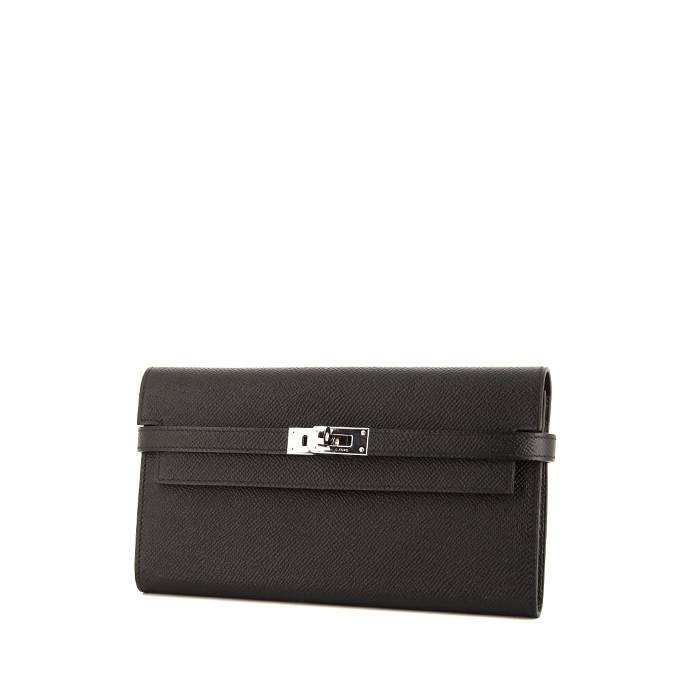 Délicat portefeuille Hermès Kelly grand modèle en cuir epsom noir, garniture en métal palladié, porté main.