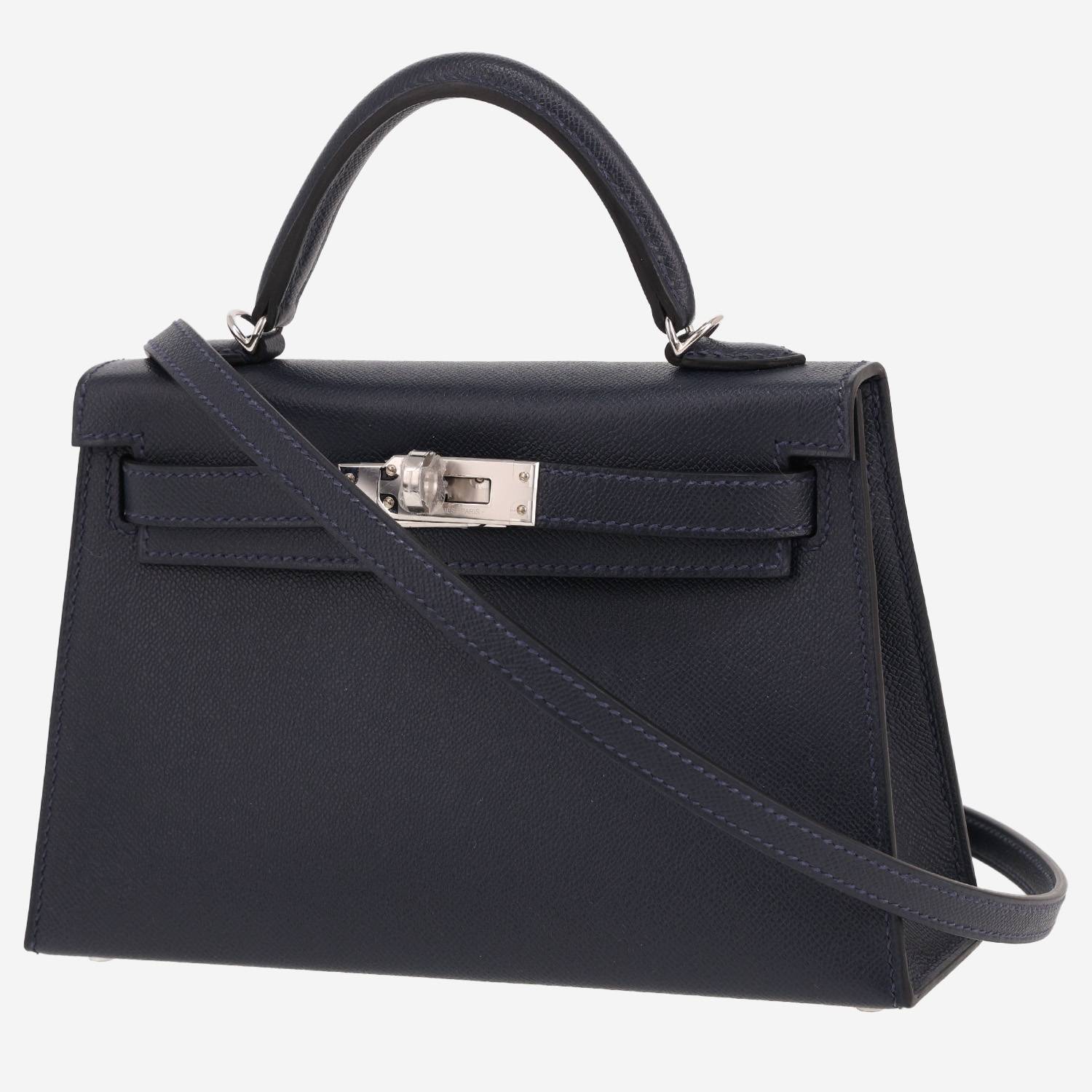 Magnifique sac à main Hermès Kelly 20 cm en Veau Madame bleu-nuit, garniture en métal palladié, poignée en cuir bleu-nuit, une anse amovible en cuir bleu-nuit permettant un porté main ou épaule ou bandoulière.
