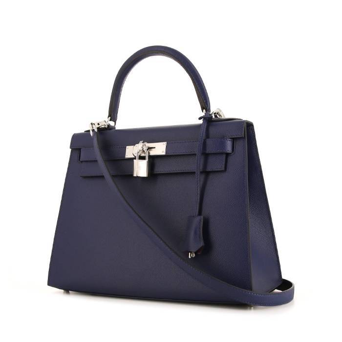 Sac à main Hermes Kelly 28 cm en cuir epsom Bleu Saphir, garniture en métal palladié, piqures sellier bleues, poignée en cuir bleu, anse bandoulière amovible en cuir bleu permettant un porté main ou épaule.