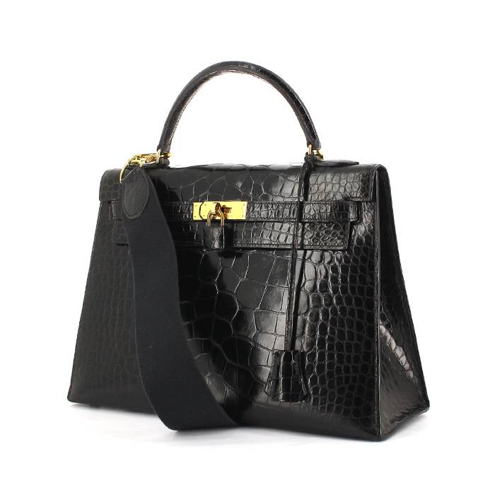 Élégant sac à main "Kelly 32 cm" en alligator noir, garniture en métal doré, poignée simple en alligator noir, une anse ajustable en toile noire permettant un porté main ou épaule.