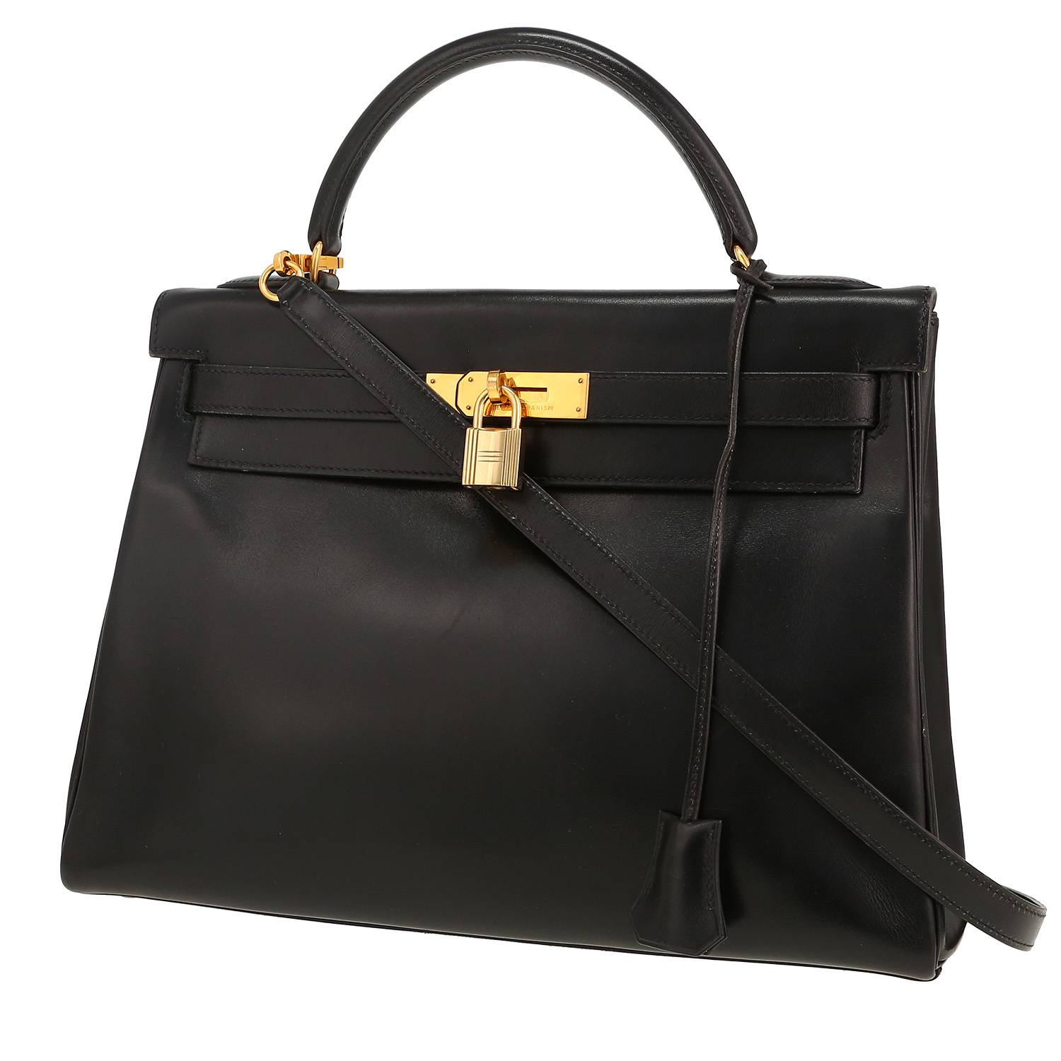 Sublime sac à main Hermès Kelly 32 cm en cuir box noir, garniture en métal doré, poignée simple en cuir noir, anse bandoulière amovible en cuir noir permettant un porté main ou épaule.