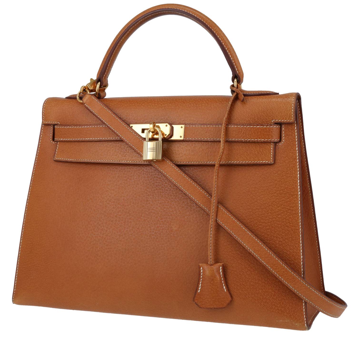 Sublime sac à main Hermès Kelly 32 cm en cuir de Pecari gold, garniture en métal doré, poignée simple en cuir gold, anse bandoulière amovible en cuir de Pecari gold permettant un porté main ou épaule.