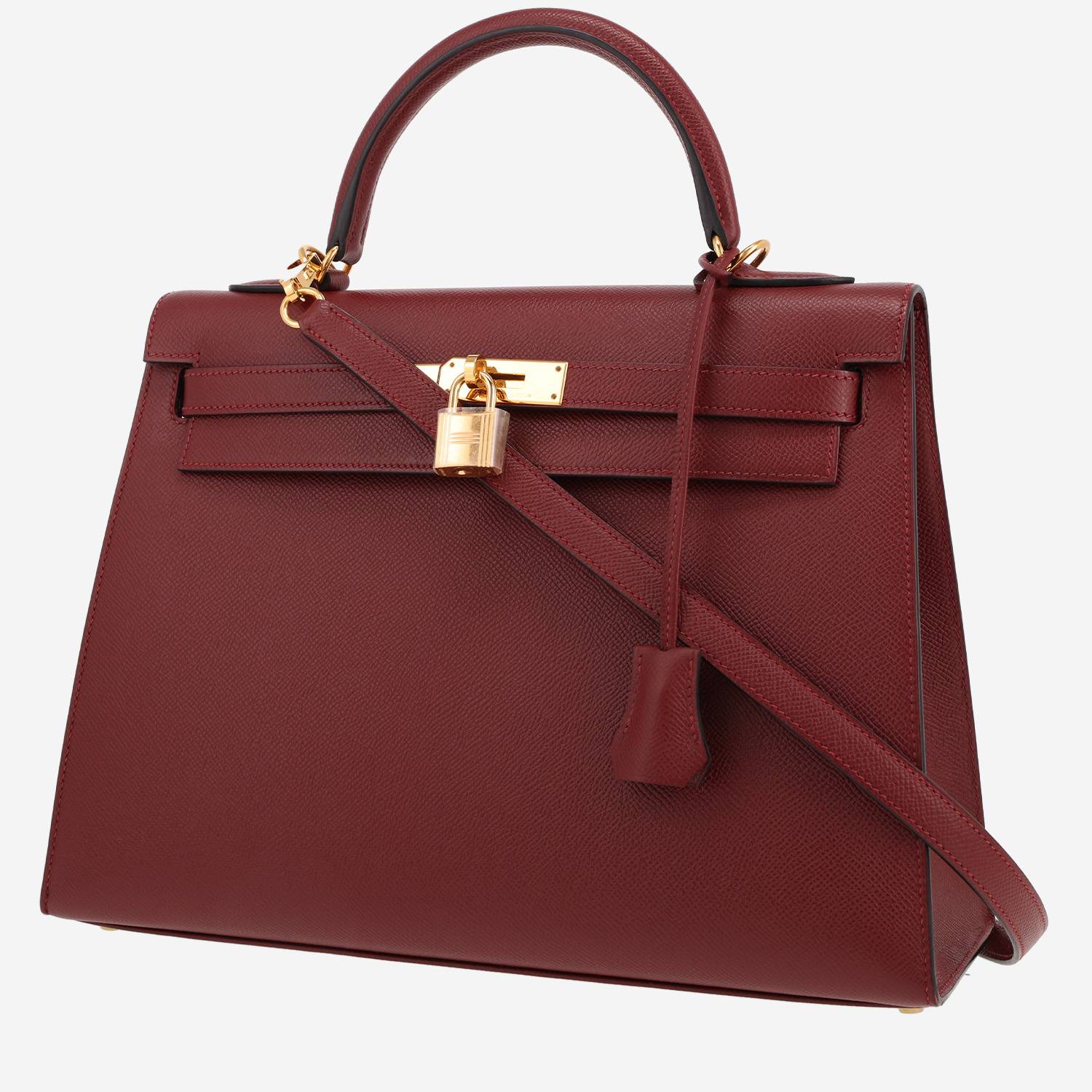 Sublime sac à main Hermès Kelly 32 cm en cuir epsom rouge H, garniture en métal doré, poignée simple en cuir rouge H, anse bandoulière amovible en cuir rouge H permettant un porté main ou épaule.