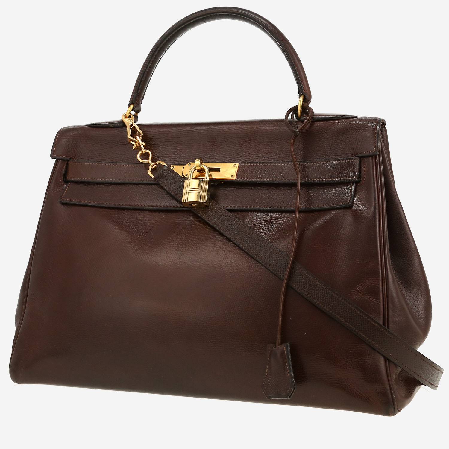 Sublime sac à main Hermès Kelly 32 cm en cuir grainé marron, garniture en métal doré, poignée simple en cuir marron, anse non signée amovible en cuir grainé marron permettant un porté main ou épaule.