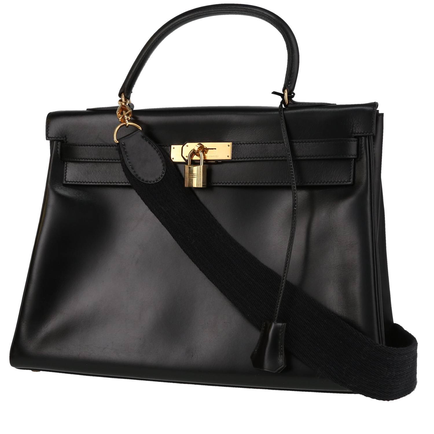Célèbre sac à main Hermès Kelly 35 cm en cuir box noir, garniture en métal doré, poignée simple en cuir noir, anse bandoulière amovible en toile noire permettant un porté main ou épaule.