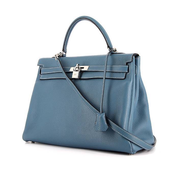 Élégant sac à main Hermes Kelly 35 cm en cuir togo bleu-jean, garniture en métal palladié, poignée simple en cuir bleu-jean, une anse amovible en cuir bleu-jean permettant un porté main ou épaule.