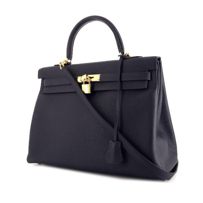 Exceptionnel sac à main Hermes Kelly 35 cm en cuir togo bleu-marine, garniture en métal doré, poignée en cuir bleu, anse bandoulière amovible en cuir bleu permettant un porté main ou épaule.