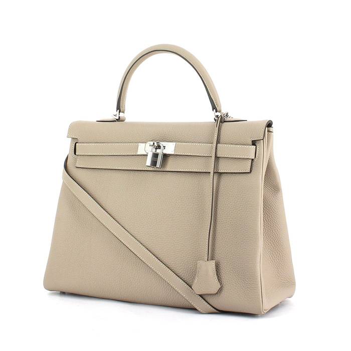 Sublime sac à main "Kelly 35 cm" en cuir togo gris-tourterelle, garniture en métal palladium, poignée en cuir gris-tourterelle, anse bandoulière en cuir gris-tourterelle permettant un porté main ou épaule.