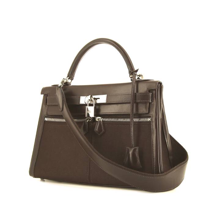 Joli et original sac à main Hermes Kelly Lakis 28 cm en cuir Swift marron et toile marron, garniture en métal palladié, poignée en cuir Swift marron, anse bandoulière amovible en cuir marron permettant un porté main ou épaule.
