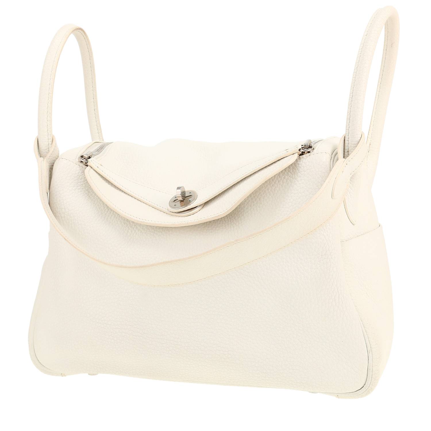 Charmant sac à main Hermès Lindy 30 cm en cuir togo blanc, garniture en métal palladié, double poignée en cuir blanc, une anse simple en cuir blanc permettant un porté main ou épaule.