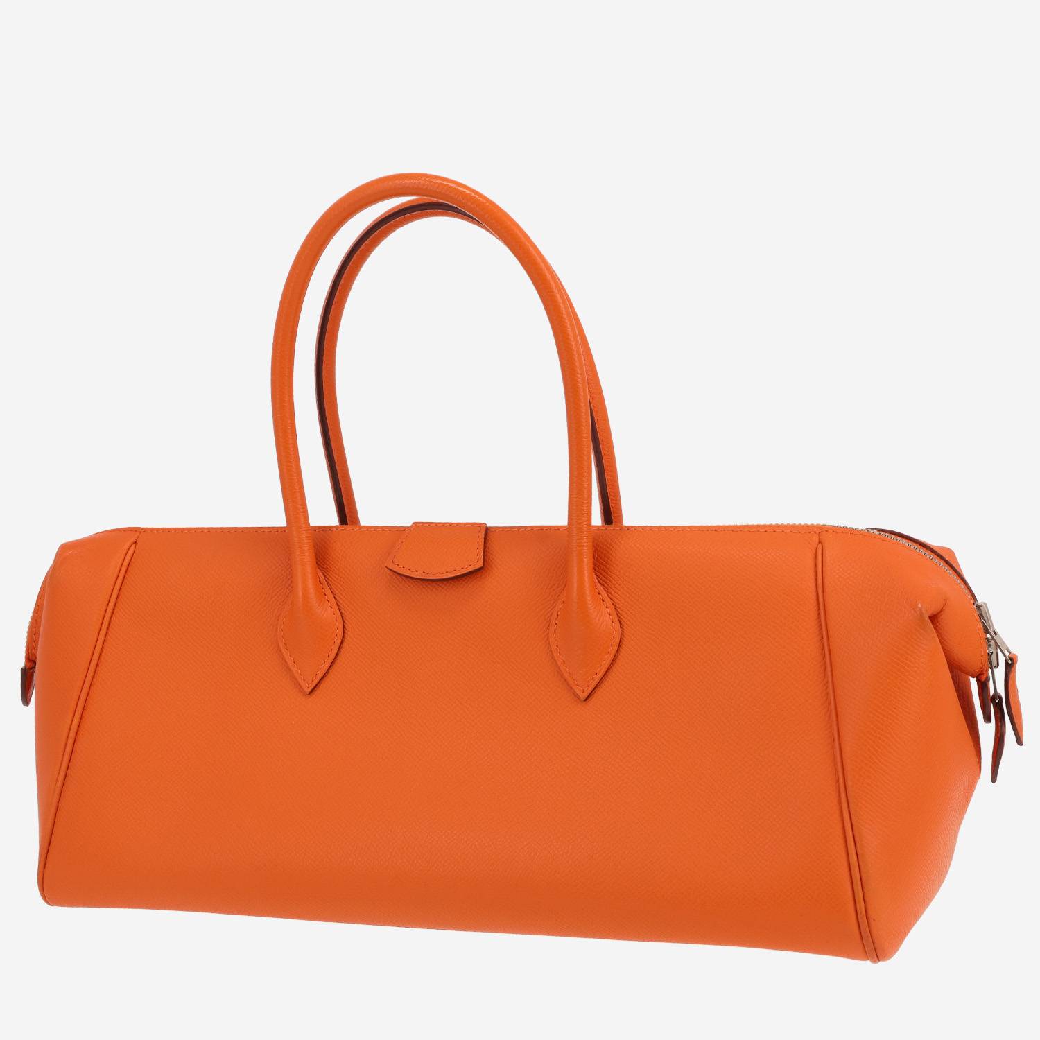 Magnifique sac à main Hermès Paris-Bombay en cuir epsom orange, garniture en métal palladié, double poignée en cuir orange permettant un porté main.