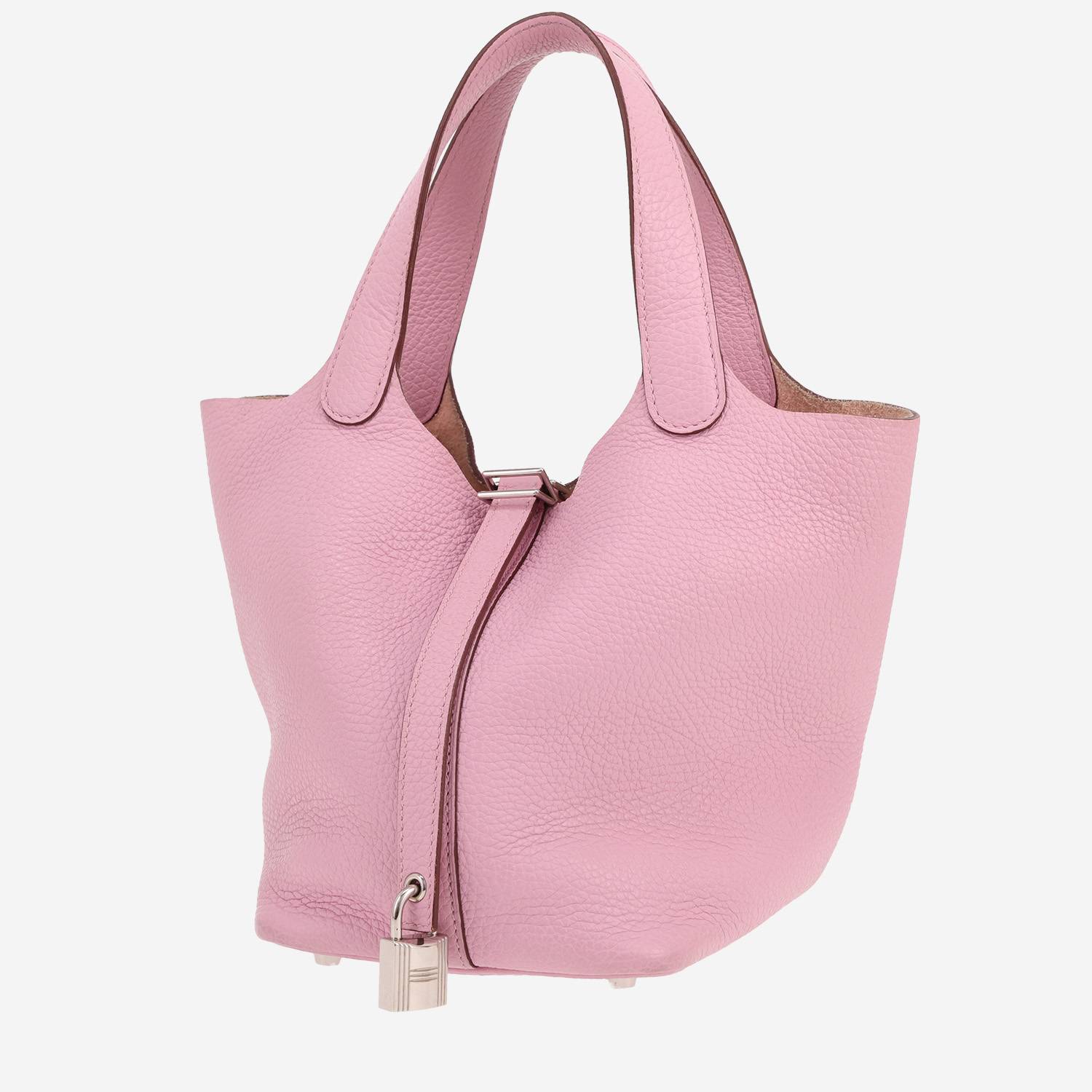 Indémodable sac à main Hermès Picotin 18 cm en cuir taurillon clémence rose, garniture en métal doré, double poignée en cuir rose permettant un porté main.
