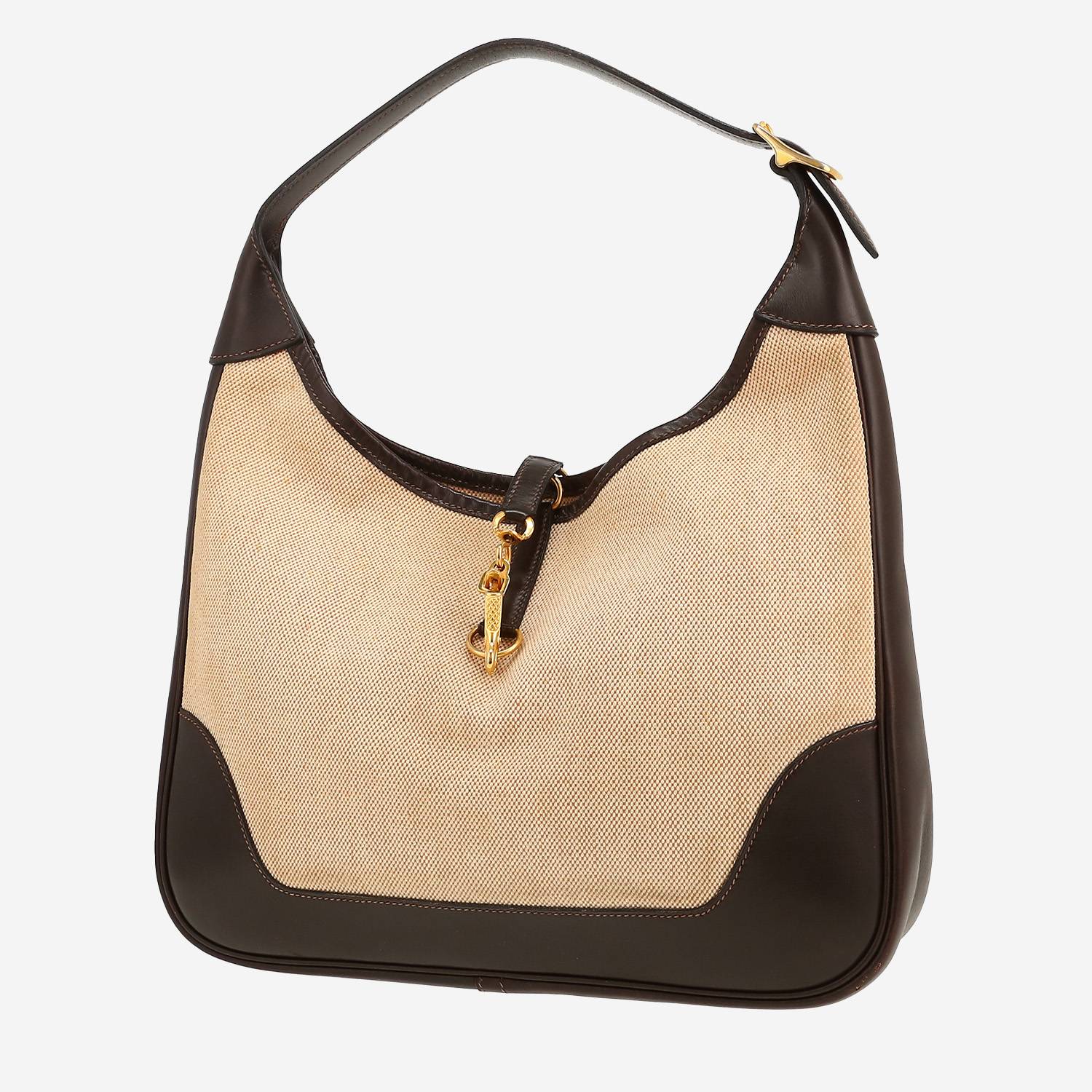 Magnifique sac porté épaule ou main Hermès Trim en toile beige et cuir box marron, garniture en métal doré, une anse en cuir marron permettant un porté main ou épaule.