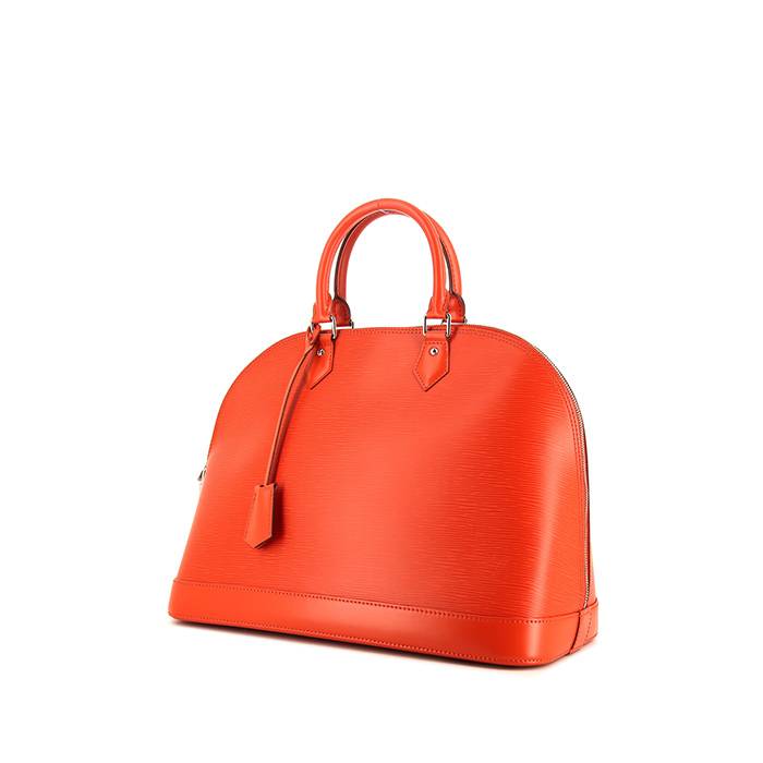 Superbe sac à main Louis Vuitton Alma grand modèle en cuir épi orange, garniture en métal argenté, double poignée en cuir orange permettant un porté main.