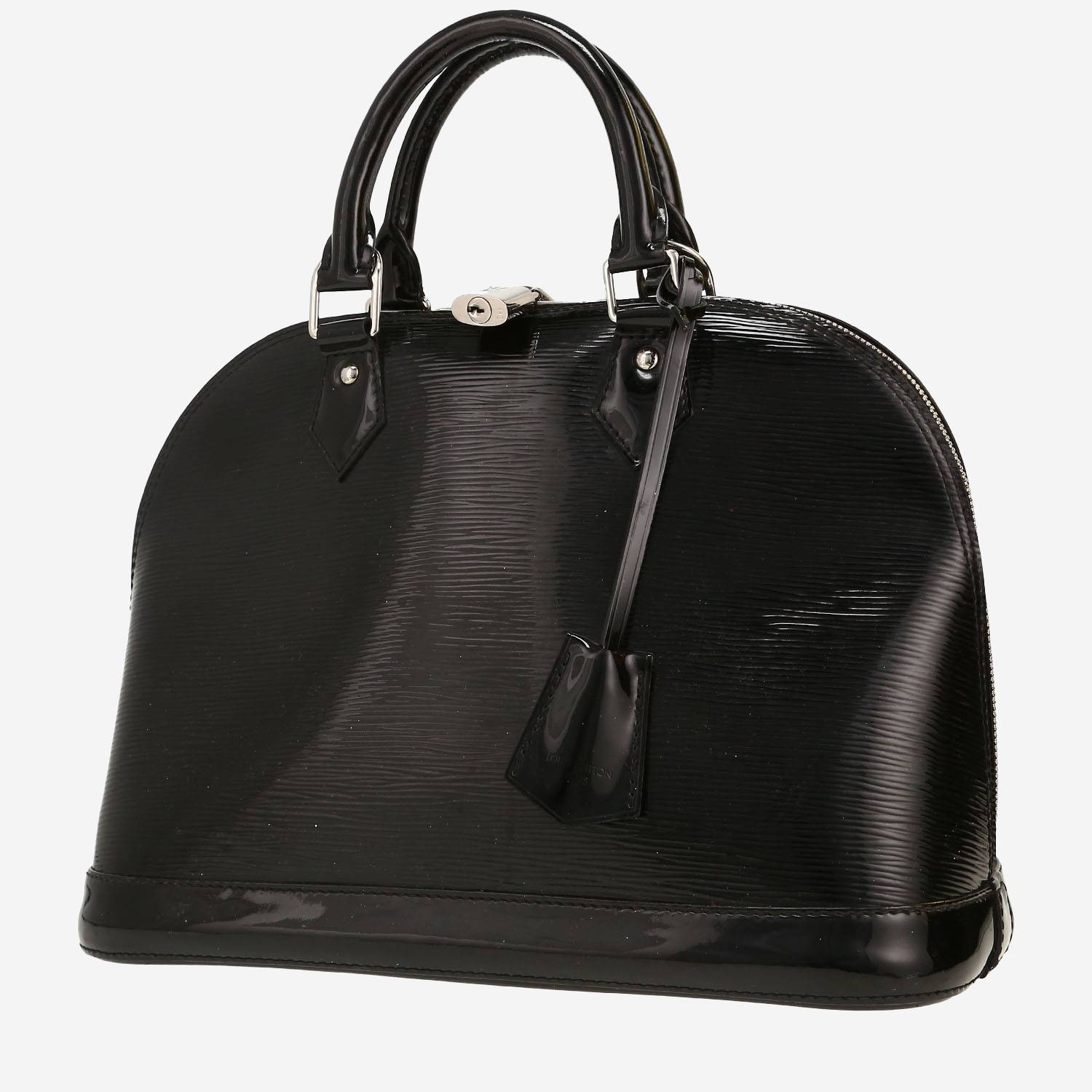 Magnifique sac à main Louis Vuitton Alma moyen modèle en cuir verni noir, garniture en métal argenté, double poignée en cuir verni noir permettant un porté main.