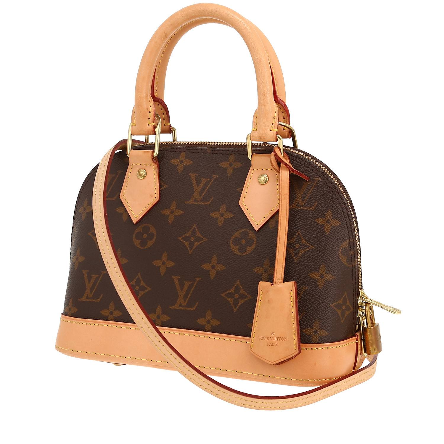 Magnifique sac bandoulière Louis Vuitton Alma BB en toile monogram marron et cuir naturel, garniture en métal doré, double poignée en cuir naturel, anse bandoulière amovible en cuir naturel permettant un porté main ou épaule ou bandoulière.