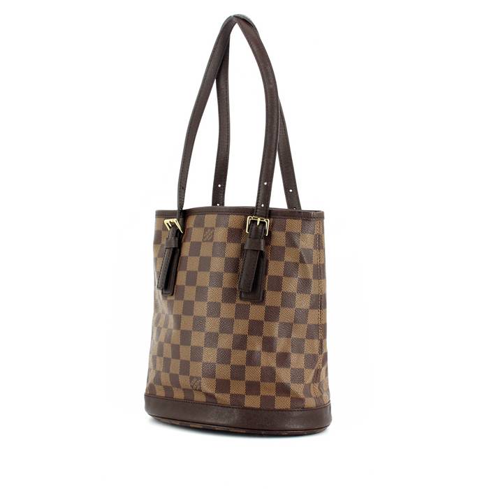Sac cabas Louis Vuitton petit Bucket en toile damier enduite ébène et cuir marron Ref Collector Square : 28 00 47