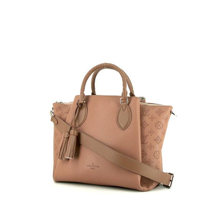 Charmant sac à main Louis Vuitton Haumea en cuir Mahina rose et cuir grainé rose, garniture en métal argenté, double poignée en cuir tressé rose, anse bandoulière amovible réglable en cuir rose permettant un porté main ou épaule ou bandoulière.