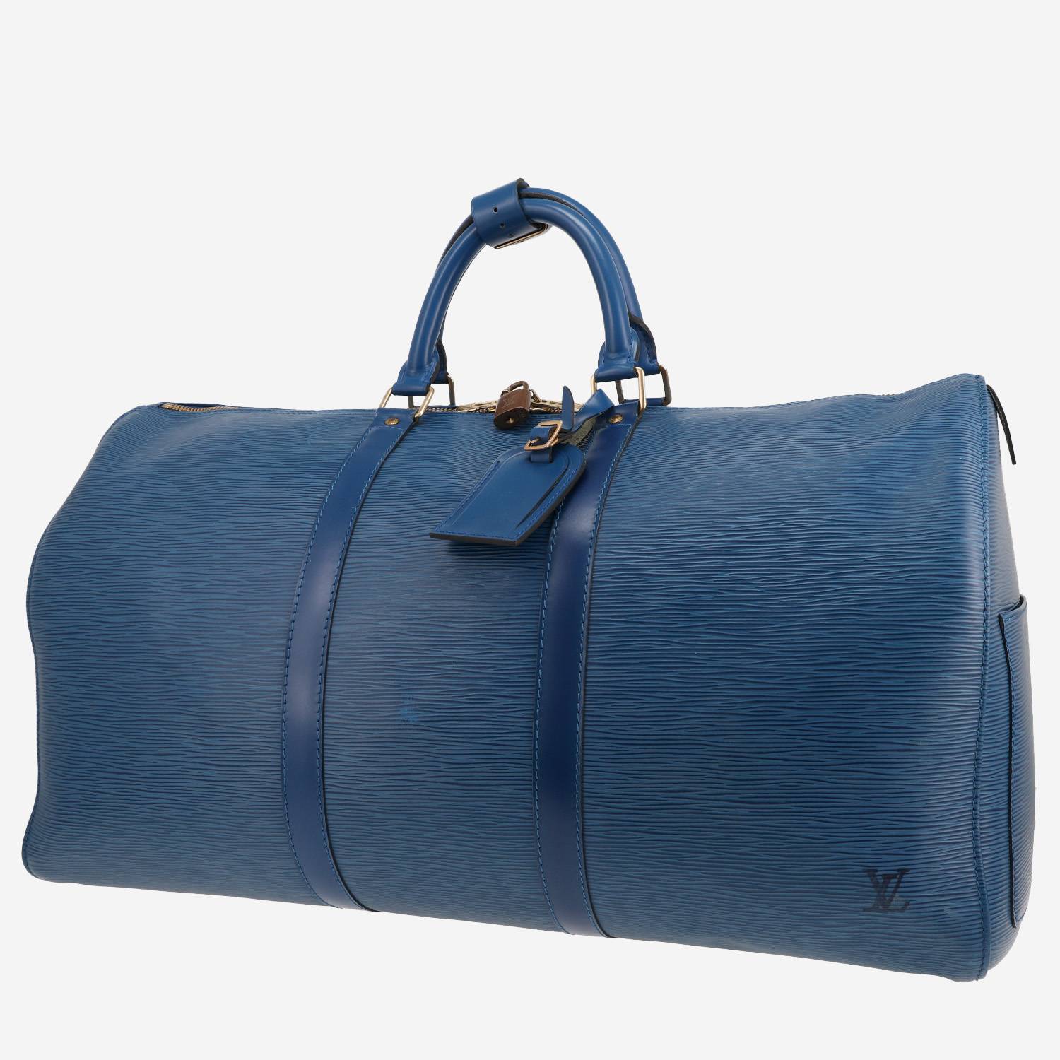 Pratique sac de voyage Louis Vuitton Keepall 45 en cuir épi bleu, garniture en métal doré, double poignée en cuir bleu permettant un porté main.