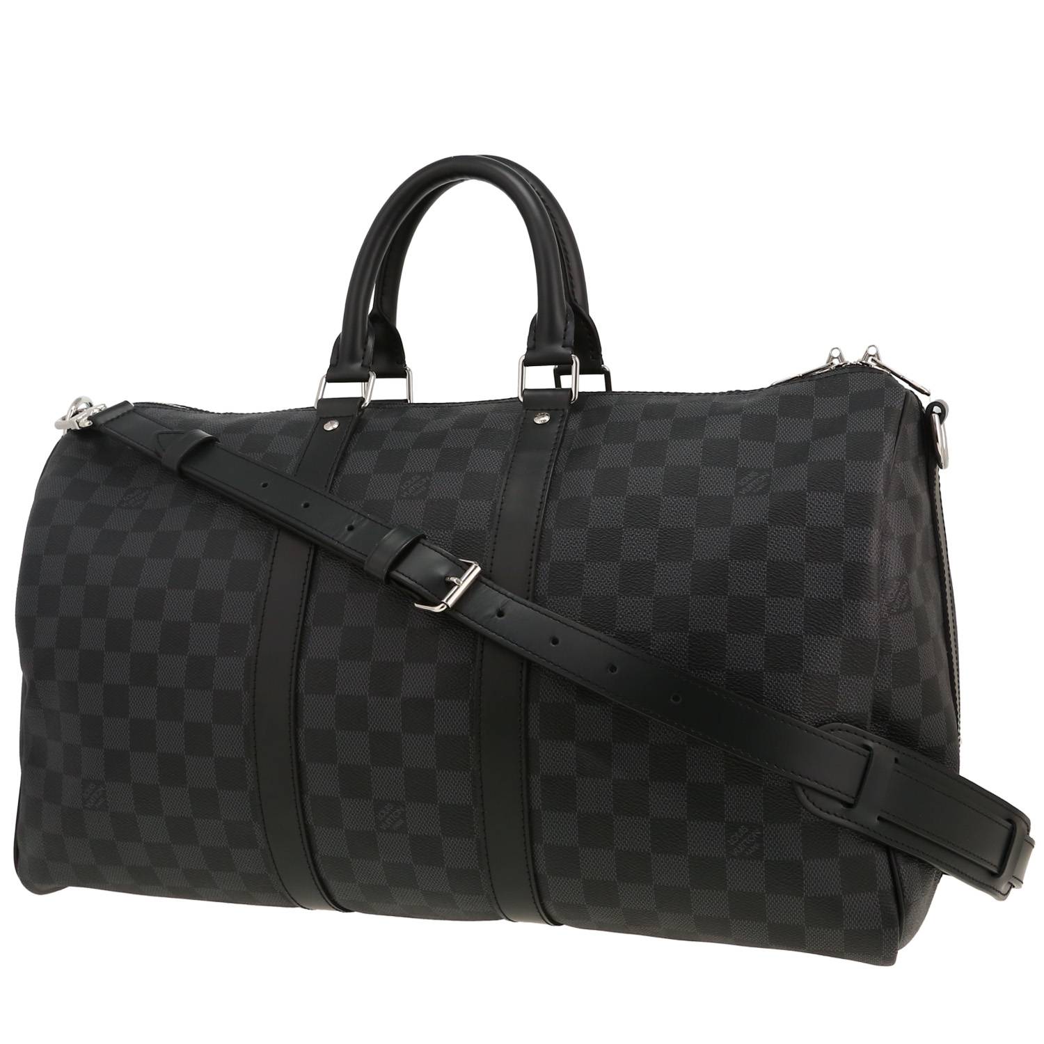 Incontournable sac de voyage Louis Vuitton Keepall 45 en toile damier gris Graphite et cuir noir, garniture en métal argenté, double poignée en cuir noir, anse bandoulière amovible réglable en cuir noir permettant un porté main ou épaule.