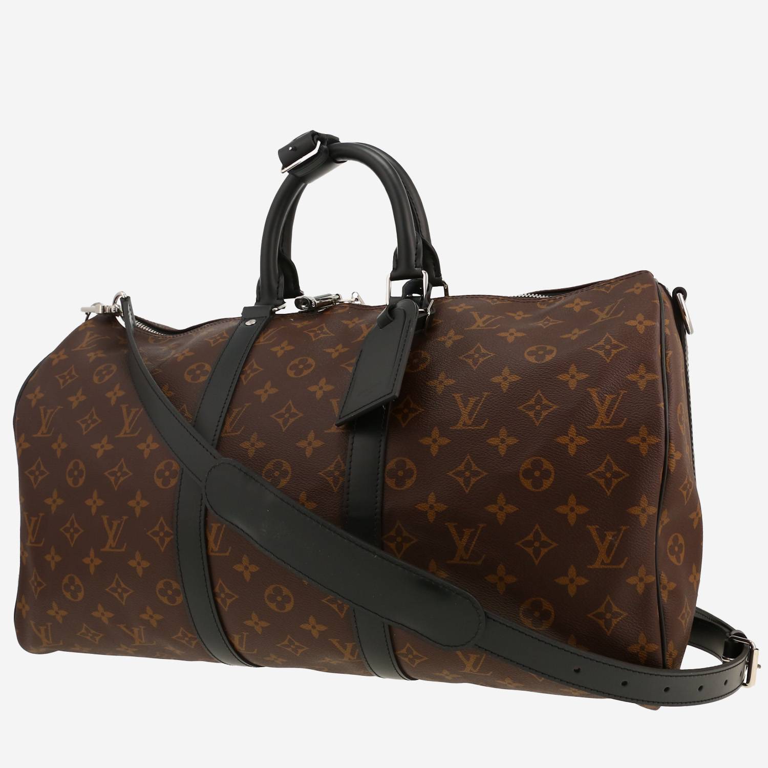 Incontournable sac de voyage Louis Vuitton Keepall 45 en toile monogram Macassar marron et cuir noir, garniture en métal argenté, double poignée en cuir noir, une anse bandoulière amovible réglable en cuir noir permettant un porté main ou épaule ou bandoulière.