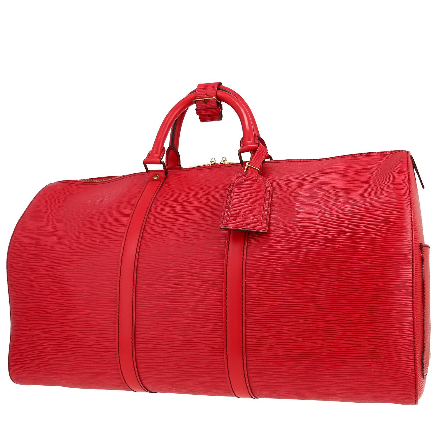 Pratique sac de voyage Louis Vuitton Keepall 50 en cuir épi rouge et cuir rouge, garniture en métal doré, double poignée en cuir rouge permettant un porté main.