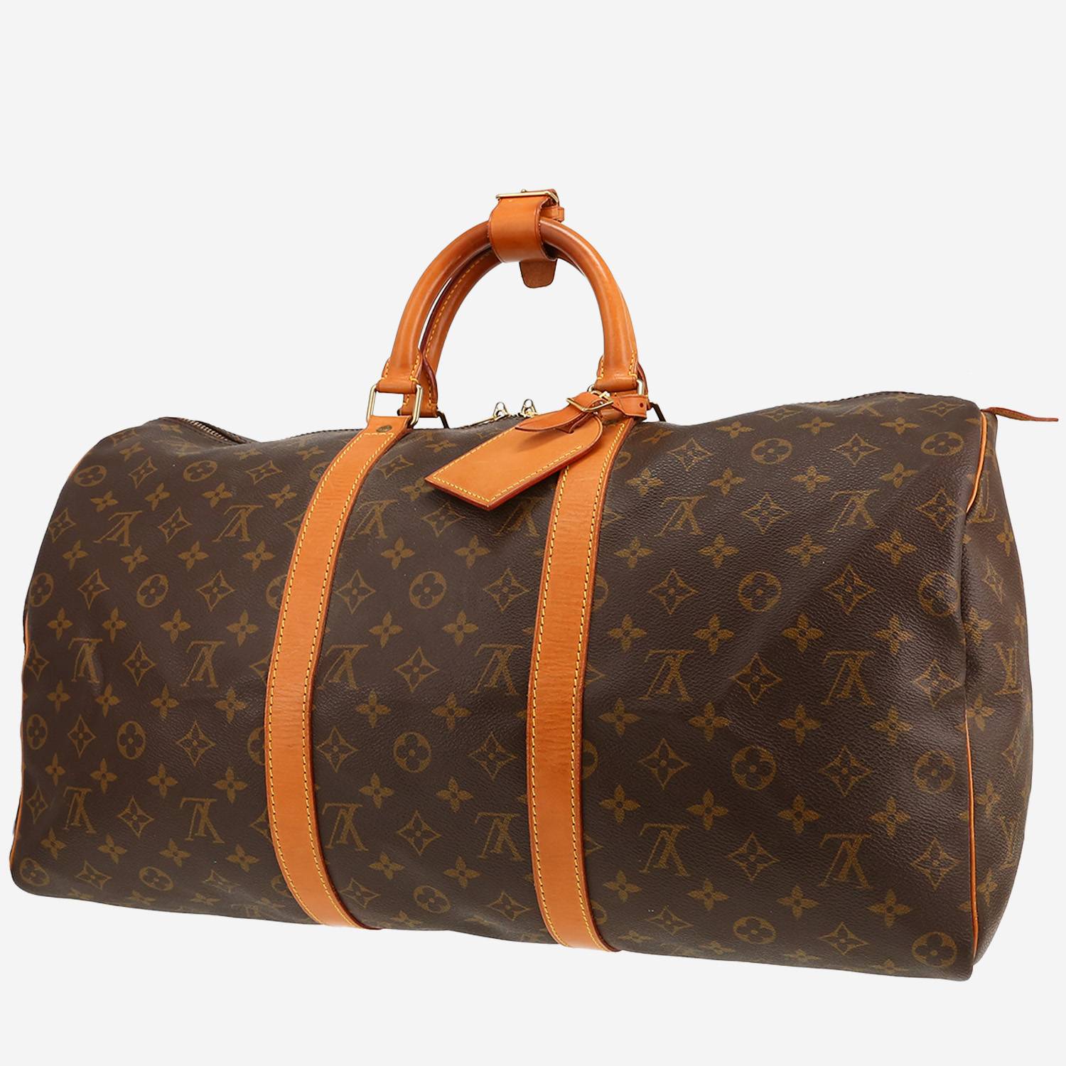 Pratique sac de voyage Louis Vuitton Keepall 50 en toile monogram marron et cuir naturel, garniture en métal doré, double poignée en cuir naturel permettant un porté main.