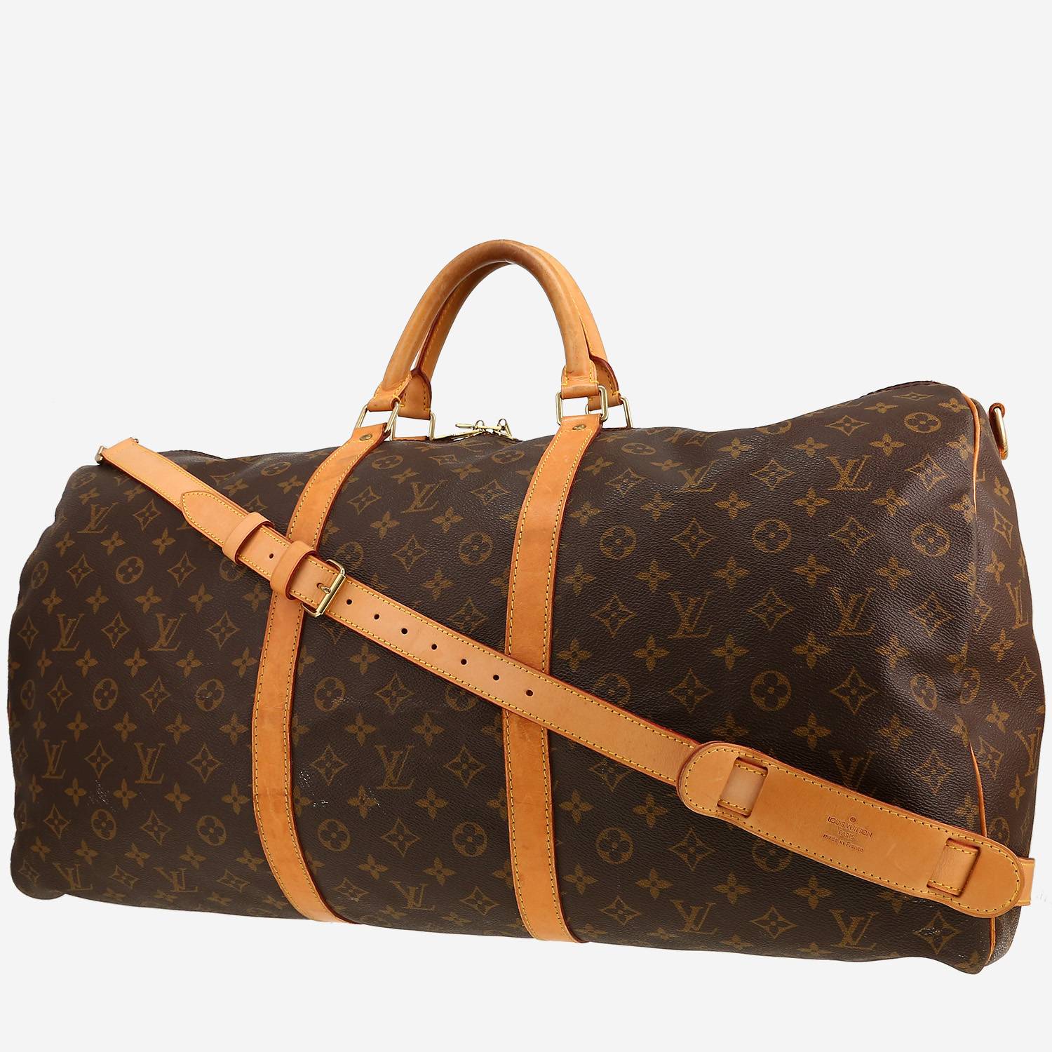 Indémodable sac de voyage Louis Vuitton Keepall 60 en toile monogram marron et cuir naturel, garniture en métal doré, surpiqures jaunes, double poignée en cuir naturel, bandoulière amovible en cuir naturel permettant un porté main ou épaule.